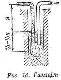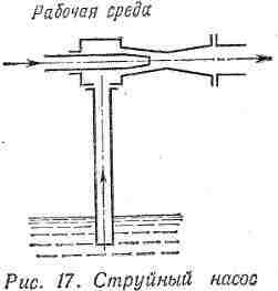 Струйные насосы (рис. 17) характеризуются наличием трубы Вентури, в центр которой подводится струя рабочей среды (вода, пар или газ). Рабочая струя образует пограничный слой и вследствие высокой скорости вначале захватывает частички окружающего воздуха, а затем вследствие обменных процессов всасывает перекачиваеемую жидкость из подводящего трубопровода. Пневматические насосы (газлифты) подают жидкость в результате образования водовоздушной смеси малой плотности при поступлении воздуха под давлением в зааглубленную под уровень жидкости трубу. Окружающая жидкость большей плотности проникает во всасывающую трубу, обеспечивая тем самым процесс подъема жидкости (рис. 18).