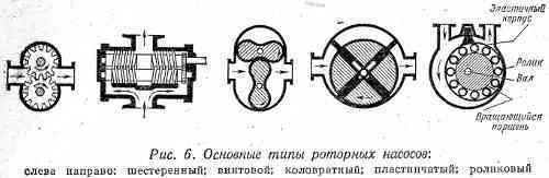 По конструктивному исполнению рабочих органов все роторные насосы делят на пять основных типов, а именно: шестеренные, винтовые, коловратные, пластинчатые, роликовые. На рис. 6 приведены эти типы роторных насосов.
