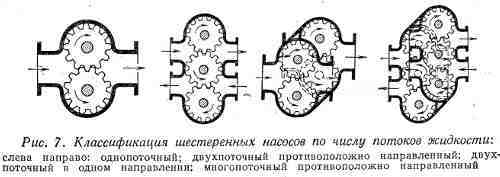 Шестеренные насосы (рис. 7) подразделяют в основном по числу шестерен (на двух-