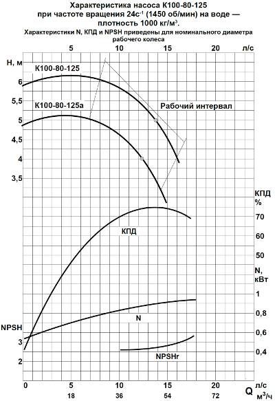 Характеристики консольных насосов типа К 100-80-160, К 100-80-125 на 1450 об/мин