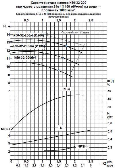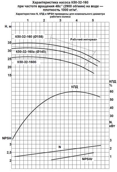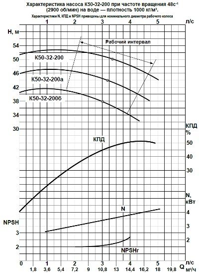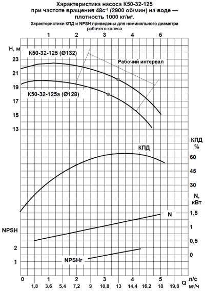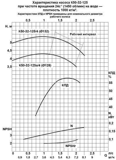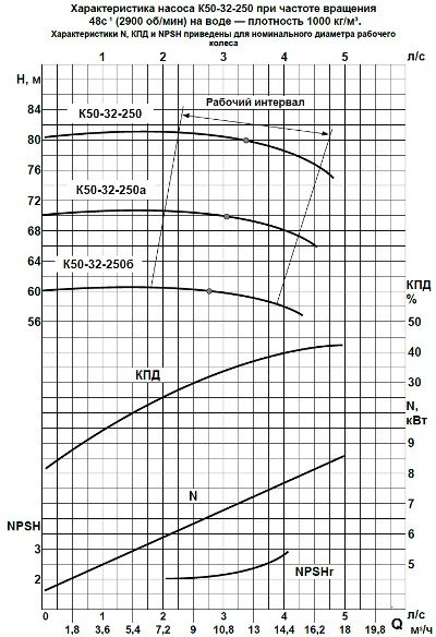 Технические характеристики насосов К50-32-125, К50-32-160, К50-32-200, К50-32-250 на 2900 об/мин