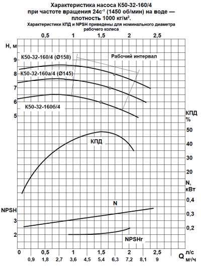 Характеристики насосов К 50-32-125, К50-32-160, К 50-32-200, К 50-32-250 на 1450 об/мин